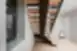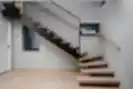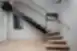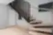 Modernūs laiptai su juodai dažyta centrine metalo sija, metaliniu turėklu ir vientiso ąžuolo pakopomis. Aiškios linijos ir išgryninta forma.