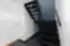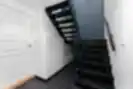 Minimalistiniai laiptai su karpytomis laiptasijomis ir stikliniu turėklu šone. Puiki tamsių laiptų ir šviesaus interjero kombinacija.