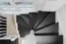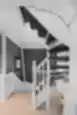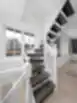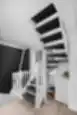 Klasikiniai laiptai su tekintais stulpais ir statramsčiais. Atviros pakopos su vaikų apsauga, dažyta tamsiai pilka spalva, harmoningai dera su baltomis laiptų detalėmis.