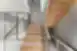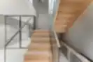 U-formos laiptai su aikštele. Skaidrus stiklas ir apvalus nerūdijančio plieno porankis kuria lengvą ir modernų įspūdį.