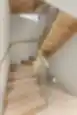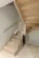 Standartiniai laiptai su karpytomis laiptasijomis ir stiklu šone, lengvas ir šiuolaikiškas sprendimas interjerui.