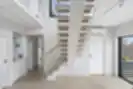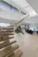 Modernūs laiptai su centrine metalo laiptasija. Skaidrus stiklas kuria atvirą, lengvą erdvės pojūtį. Laiptuose integruotas stiklo porankis, balkone palikta švari stiklo linija be porankio.
